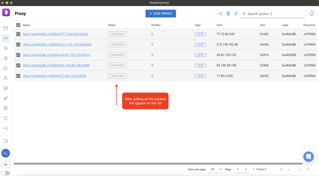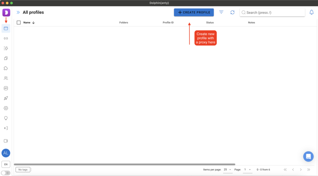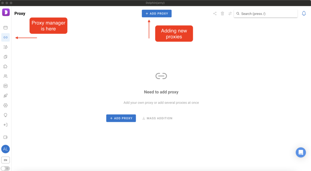 Setting up a proxy server for Dolphin{anty} is quite simple. To do this, you need to navigate to the Proxy Manager, whose icon is located on the left sidebar, and then click "Add proxy."