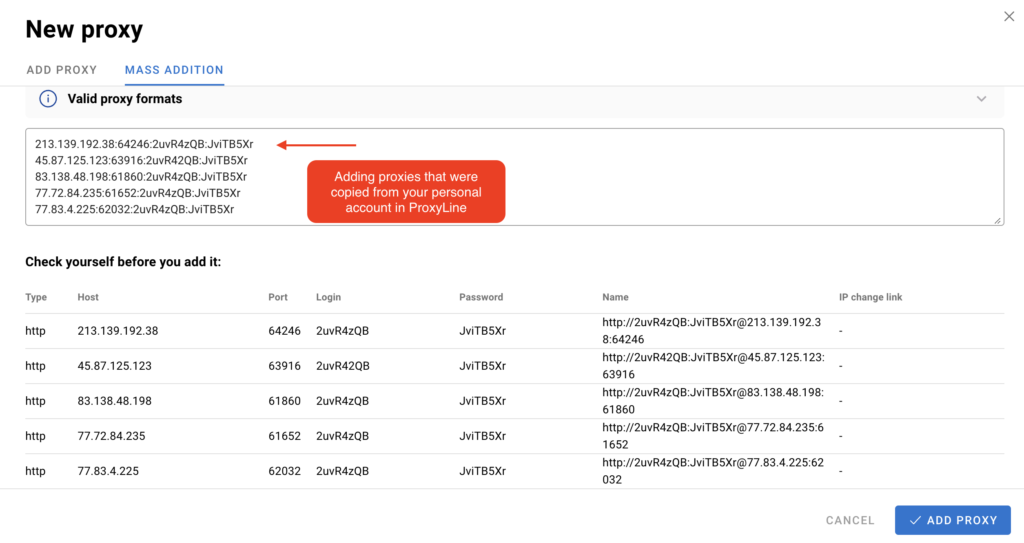 Copy the proxies previously created in your Proxylines account and paste them into the appropriate field, then click "Add.":