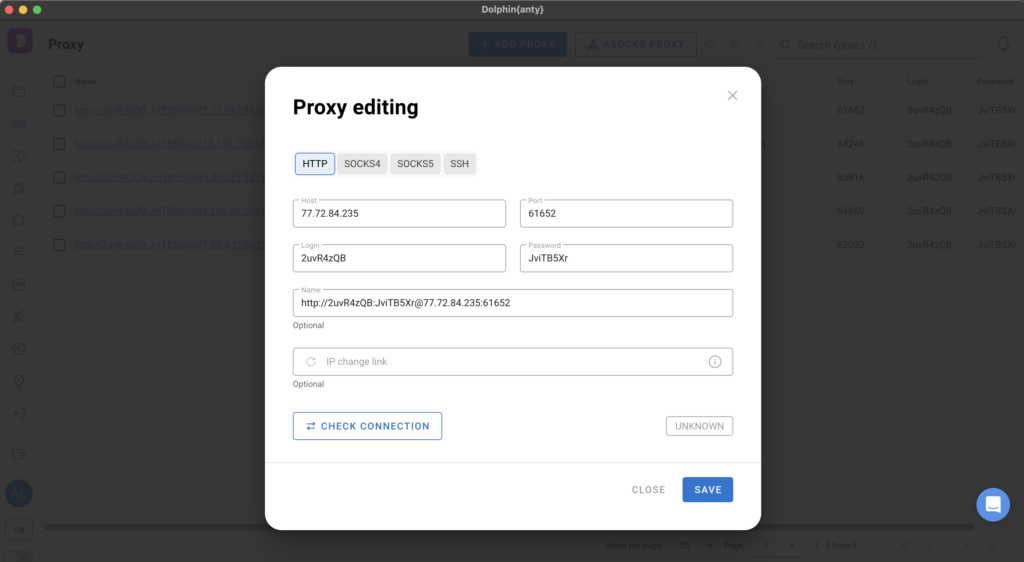 So, you can add any number of servers, using them for your work. And if you want to edit the proxy data, just click on the proxy itself, and in the open window you can change the data:
