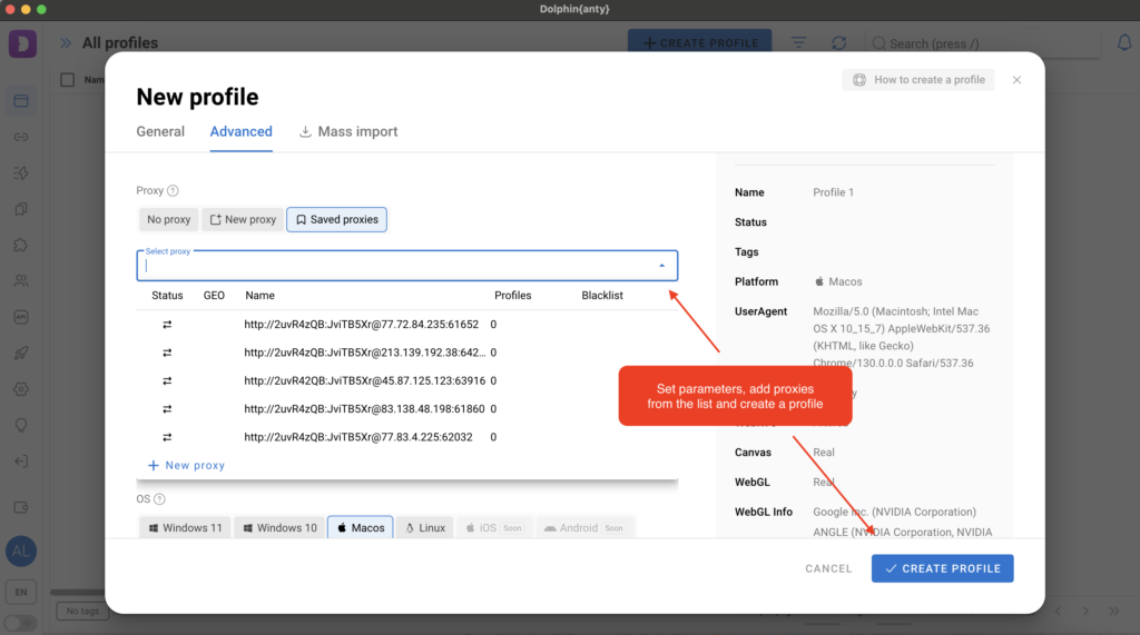 Configure the parameters, select previously added proxies and then create our profile.