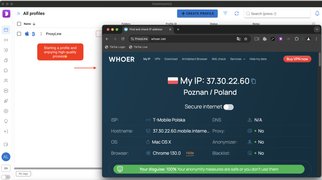 And then - the most interesting thing: launch a profile and enjoy our high-quality proxy servers with the best anti-detection browser Dolphin{anty}.