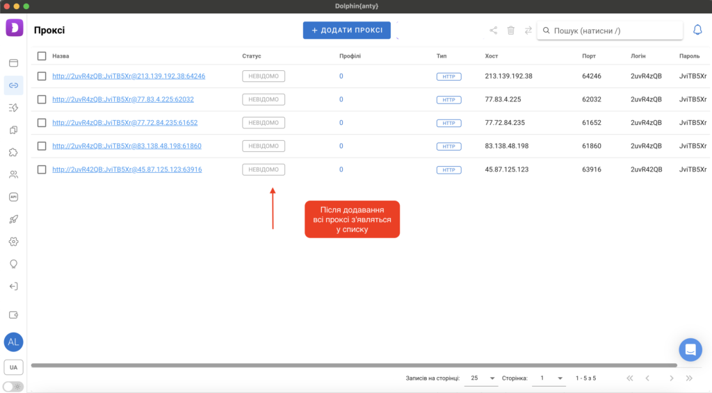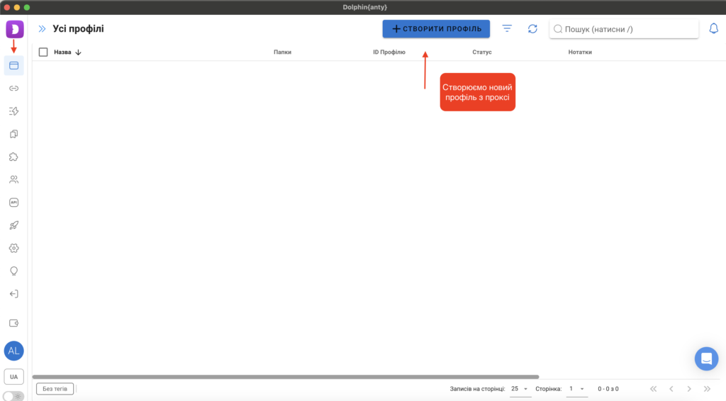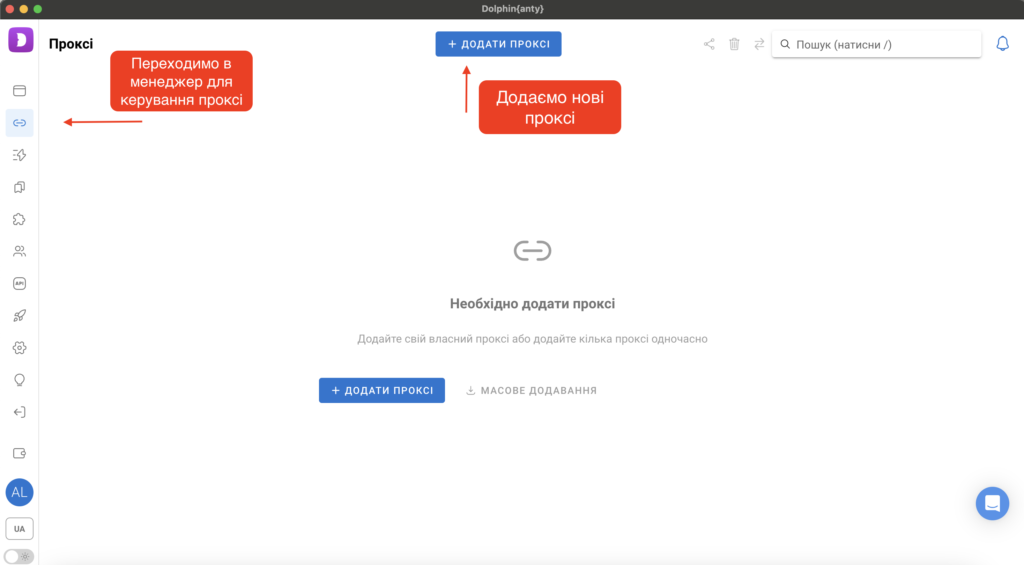 Налаштувати проксі сервер в Dolphin{anty} достатньо просто. Для цього Вам необхідно перейти в менеджер керування проксі, іконка якого розміщена в лівій бічній панелі, а потім натисніть "Додати проксі".