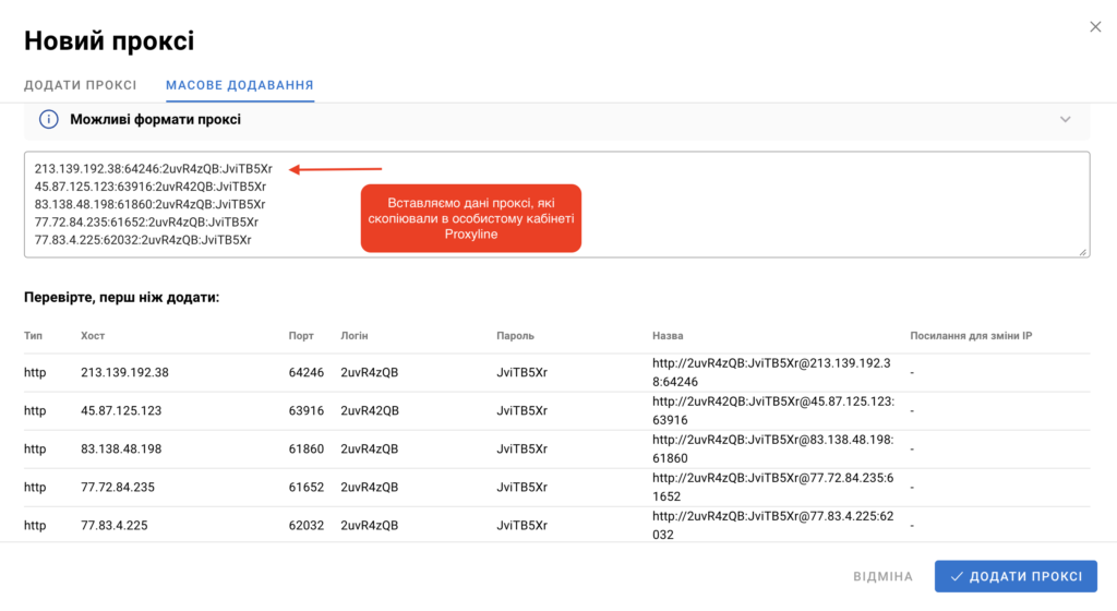 Раніше сформовані в особистому кабінеті Proxylines проксі копіюєте та вставляєте у відповідне поле, далі тиснемо "Додати":
