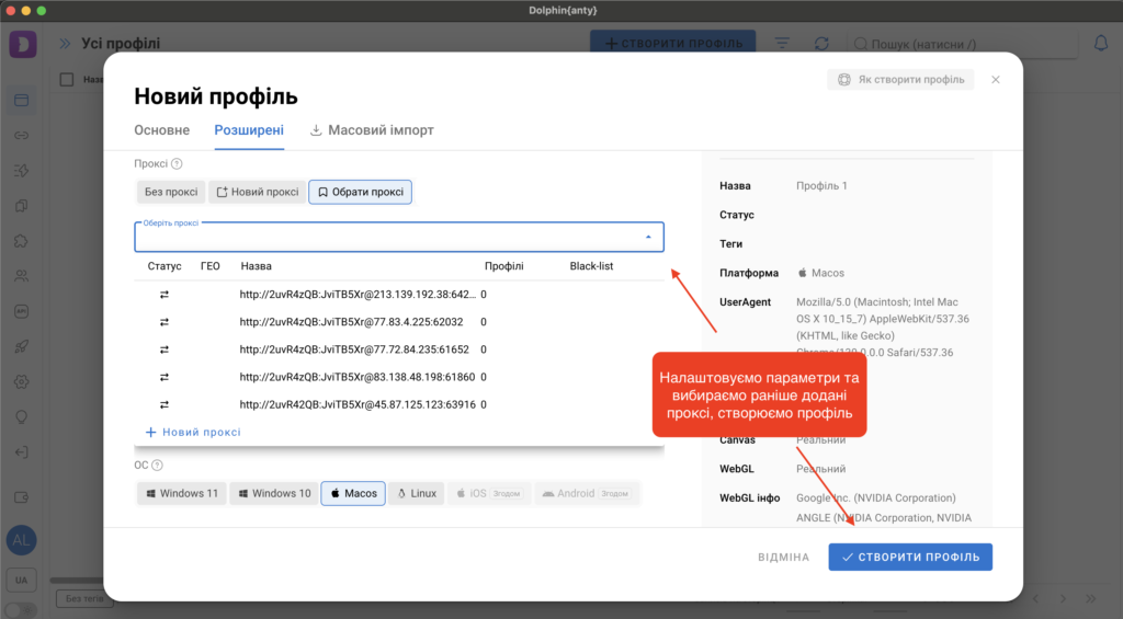 Налаштовуємо параметри, вибираємо раніше додані проксі та далі створюємо свій профіль.
