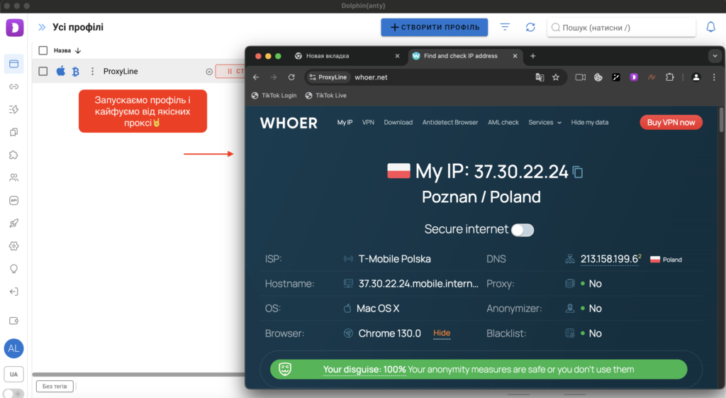 І далі — найсмачніше: запускаємо профіль і отримуємо задоволення від наших якісних проксі серверів з найкращим антидетектом браузером Dolphin{anty}.